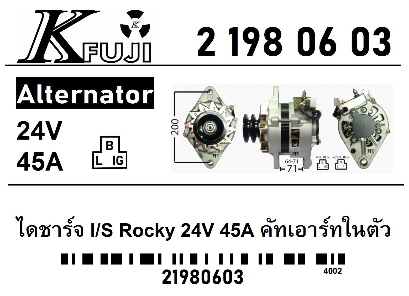 ไดชาร์จ ISUZU Rocky 24V 45A คัทเอาร์ทในตัว , นอกตัว