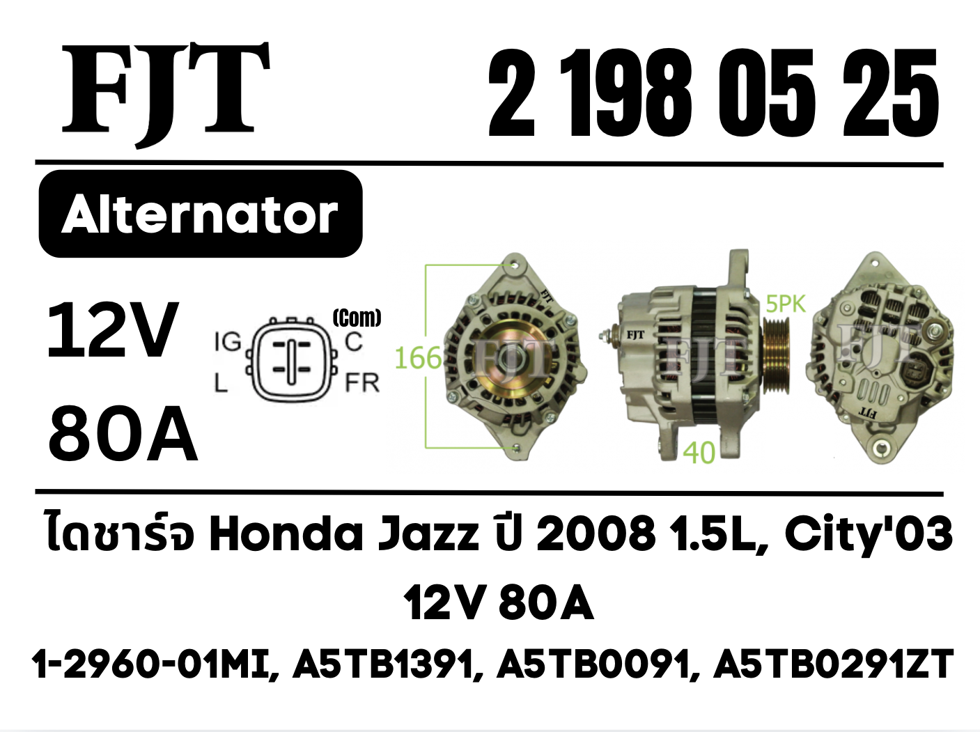 ไดชาร์จ สำหรับ Honda Jazz ปี 2008 1.5L, City 2003 12V 80A