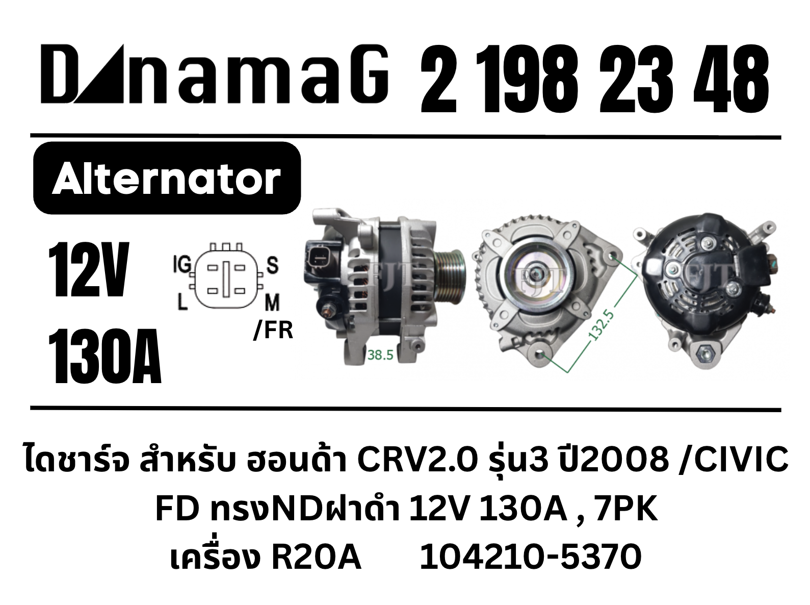ไดชาร์จ CRV Gen3'08/CIVIC FD/ 2.0L ทรงNDฝาดำ 12V 130A