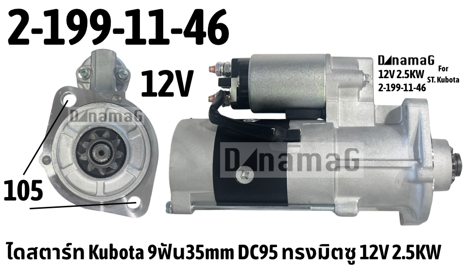 ไดสตาร์ท สำหรับ Kubota 12V 9ฟัน35mm รูห่าง 105mm DC95 ทรงมิตซู