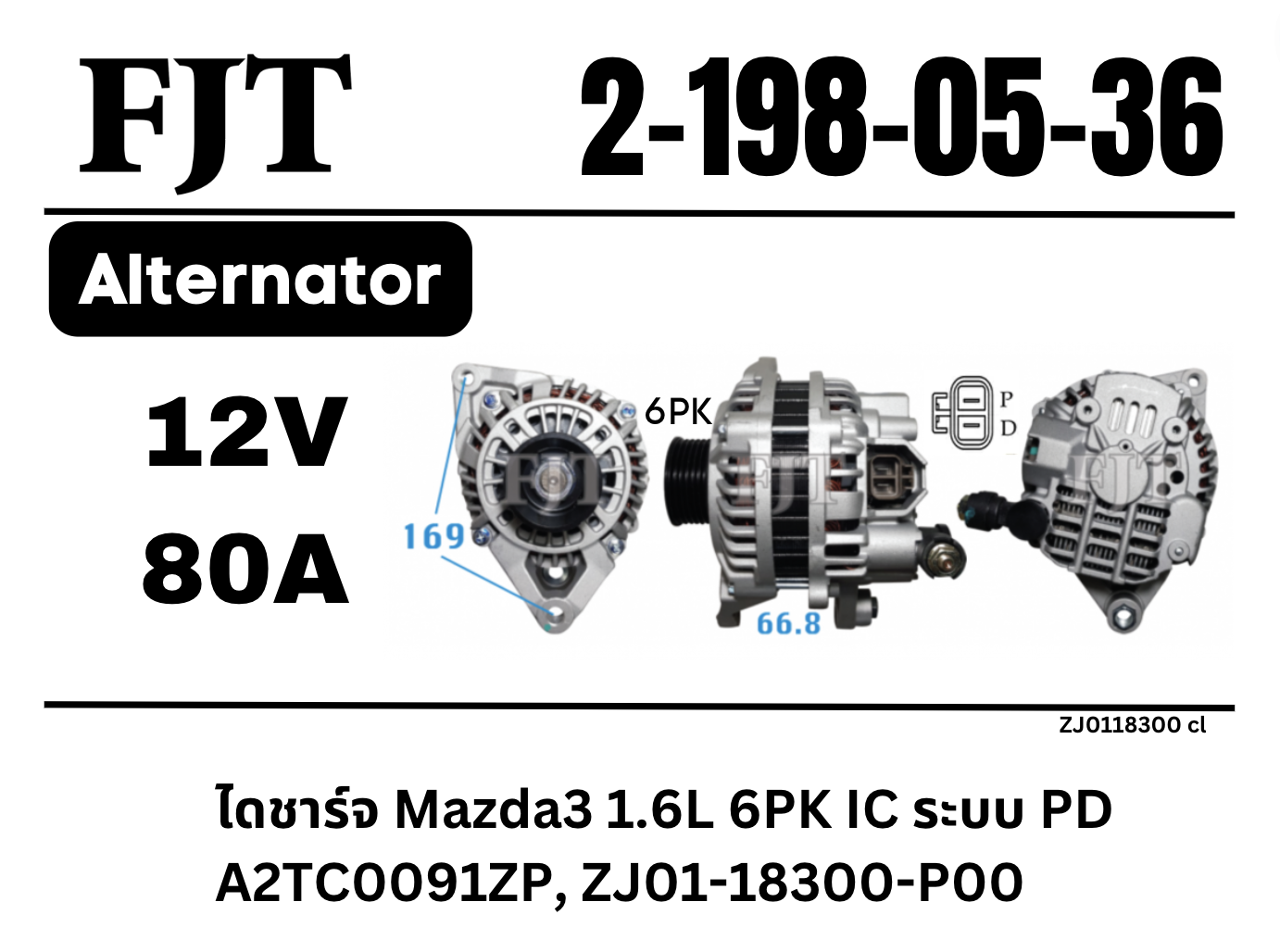 ไดชาร์จ Mazda3 1.6L A2TC0091 12V 80A 6PK PD 2-198-05-36