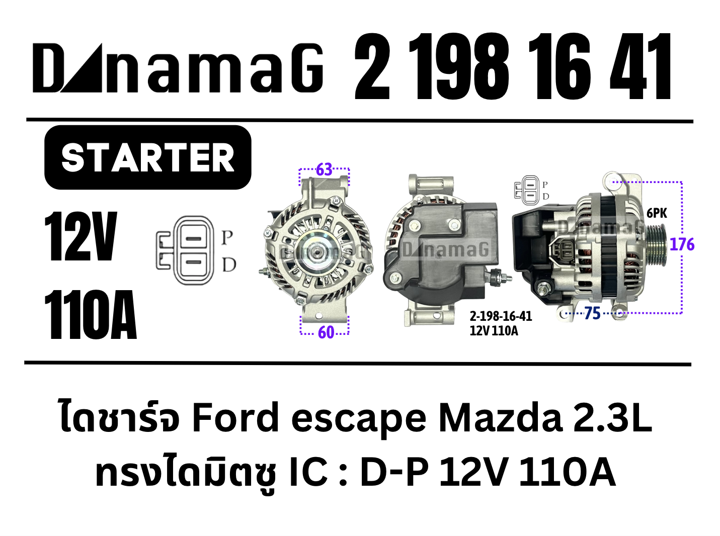 ไดชาร์จ สำหรับ Ford Escape Mazda 2.3L ไดทรงมิตซู IC : D-P 12V 110A 6PK 21981641
