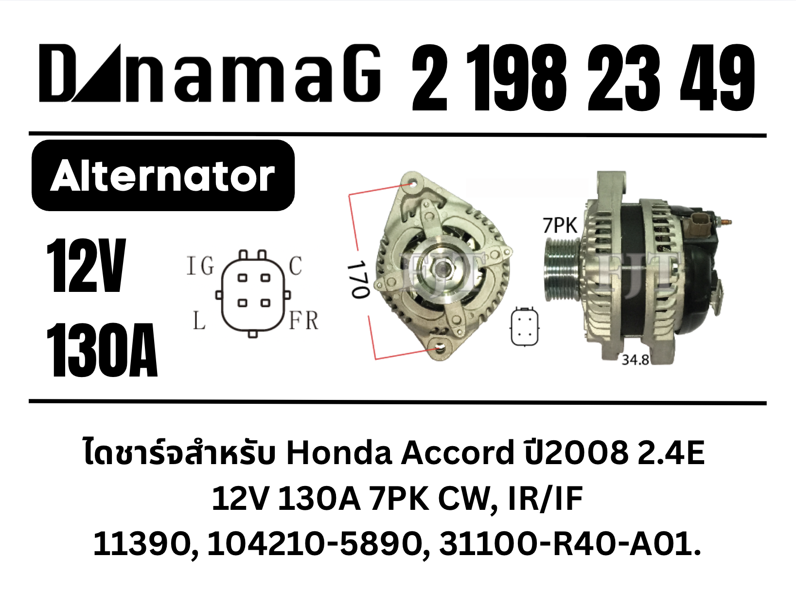 ไดชาร์จสำหรับ Honda Accord ปี2008 2.4E 12V 130A 7PK CW, IR/IF