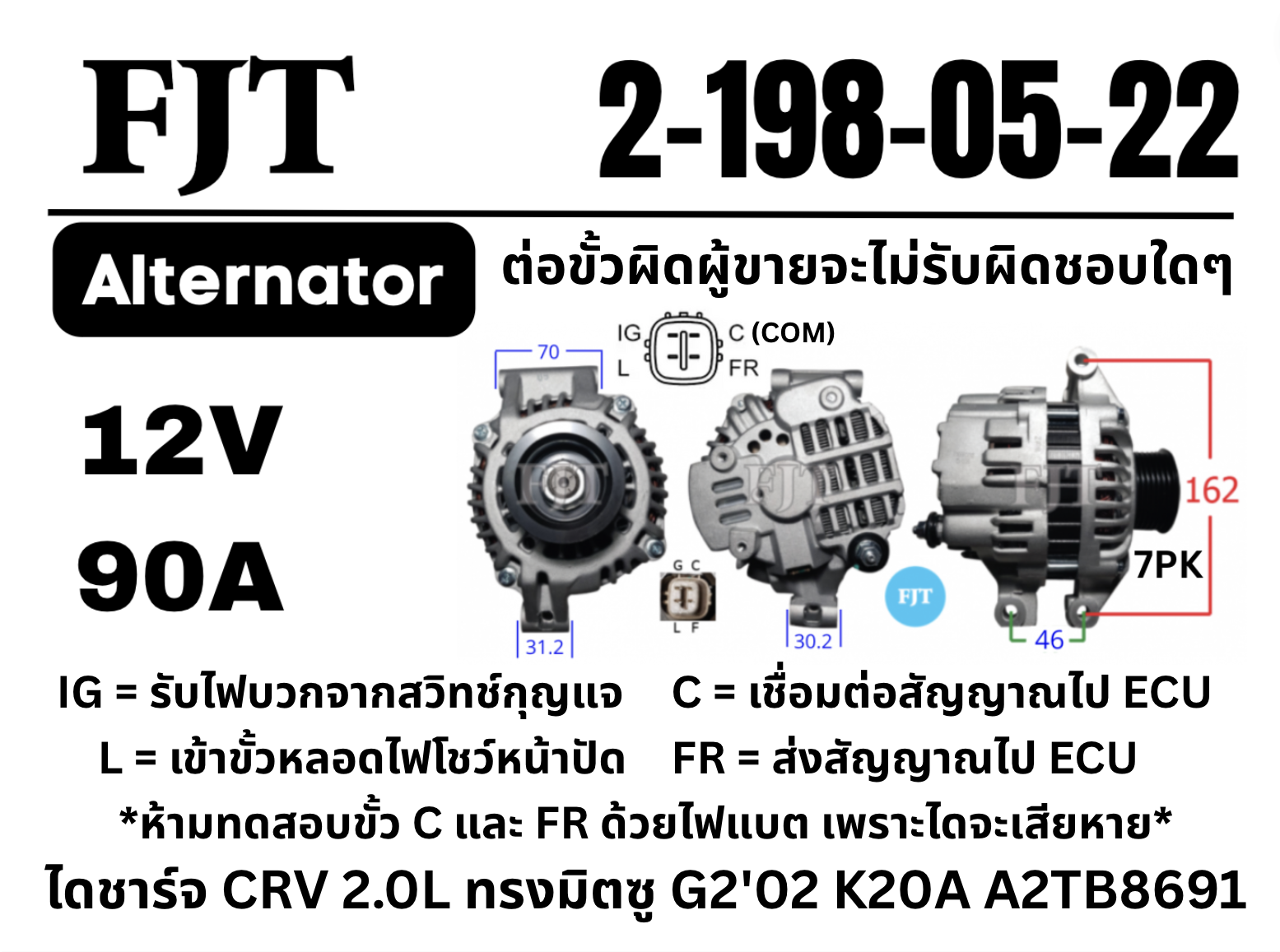 ไดชาร์จ CRV 2.0L แบบมิตซู gen2 ’02 K20A 90A 2-198-05-22