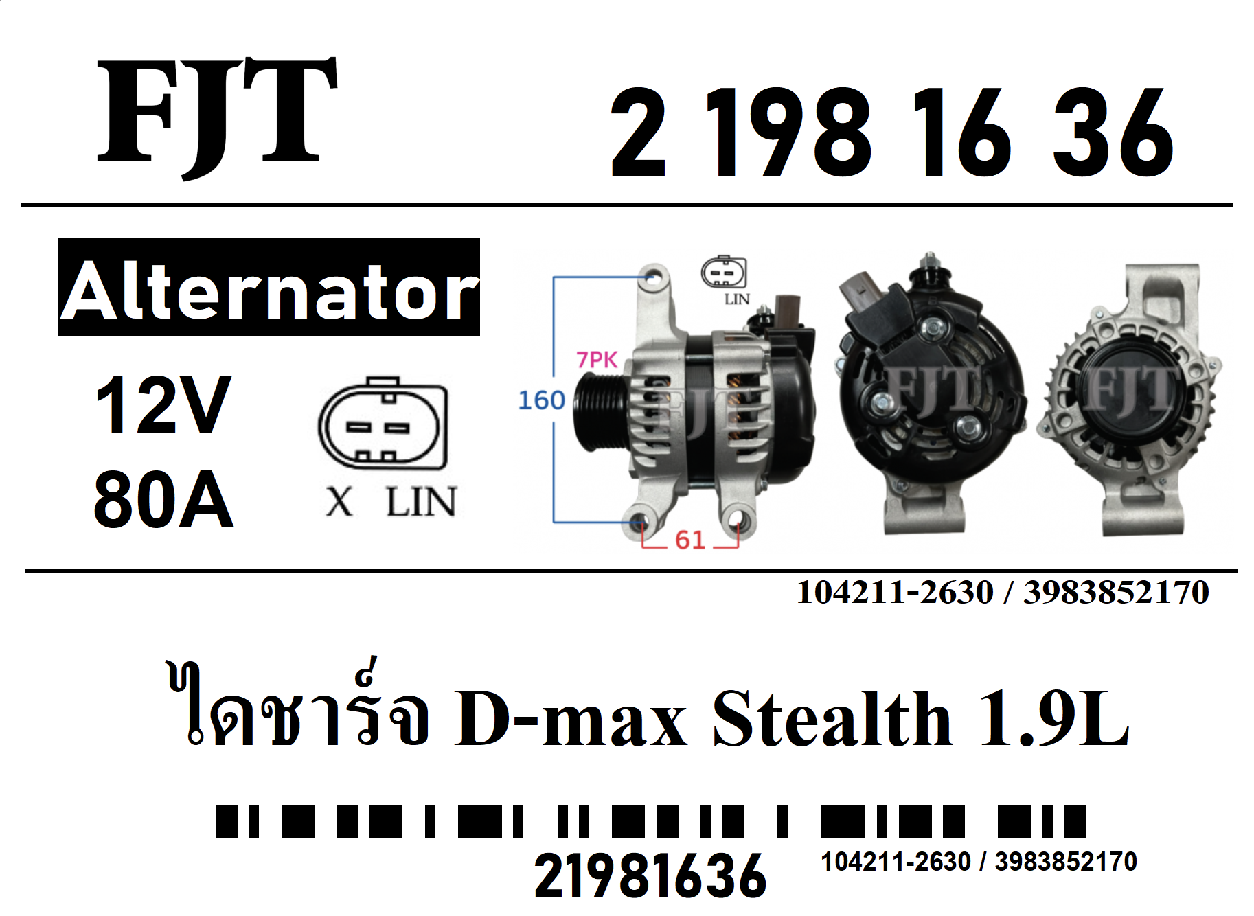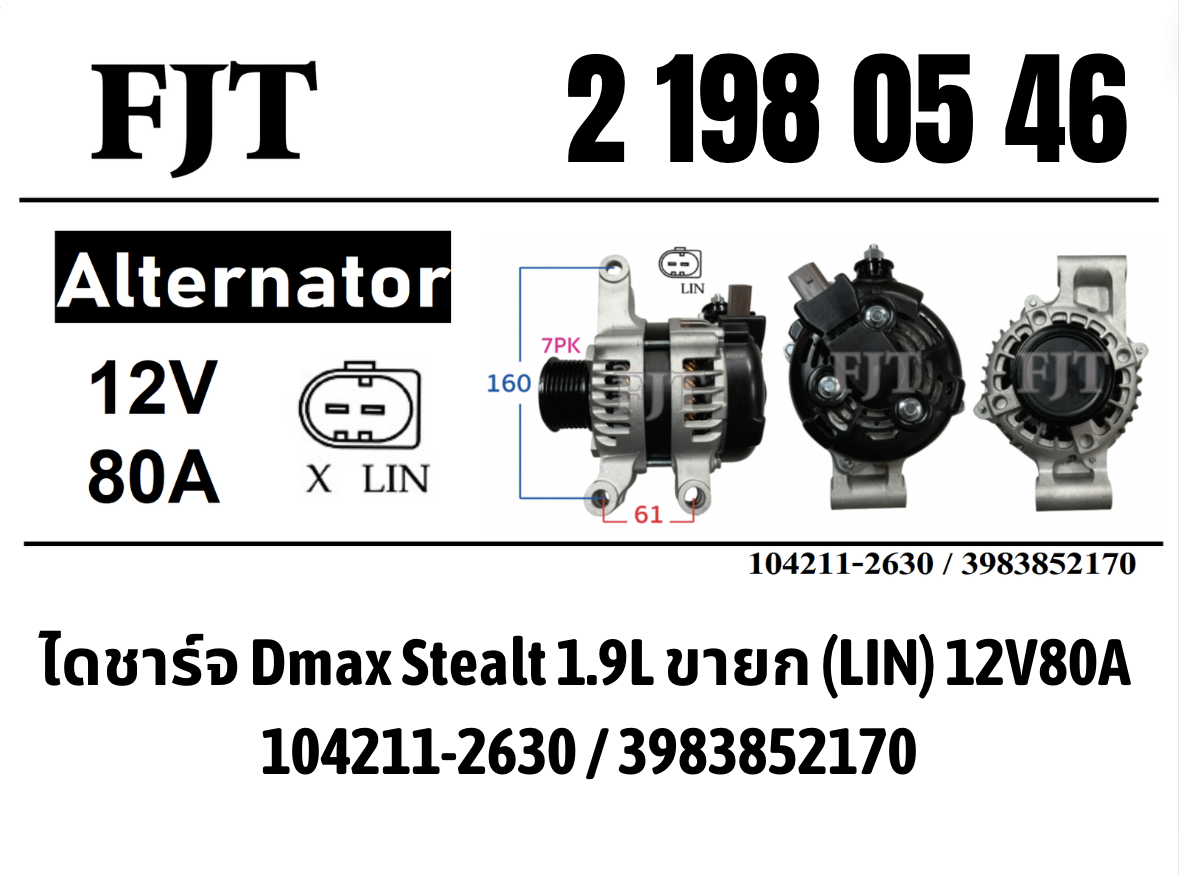 ไดชาร์จ สำหรับ อีซูซุ D-max Stealth ขายก 1.9L 12V 80A 7PK ระบบ LIN